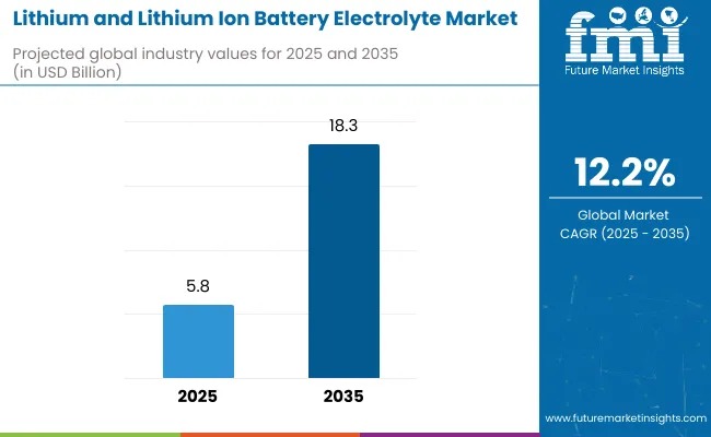 The lithium and lithium-ion battery electrolyte market is projected to grow from USD 5.8 billion in 2025 to USD 18.3 billion by 2035, exhibiting a CAGR of 12.2%